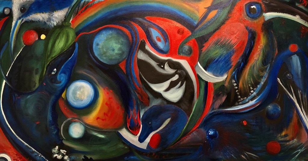 Cedar Fox is an artist based in central Wisconsin, whose diverse work—from traditional oil, ink, and acrylic painting to found-object collage, mask-making and upcycled art—responds to personal and political themes, blending curiosity and exploration with an underlying optimism focused on empathy, resilience, ingenuity, equality, and the potential for transformative change