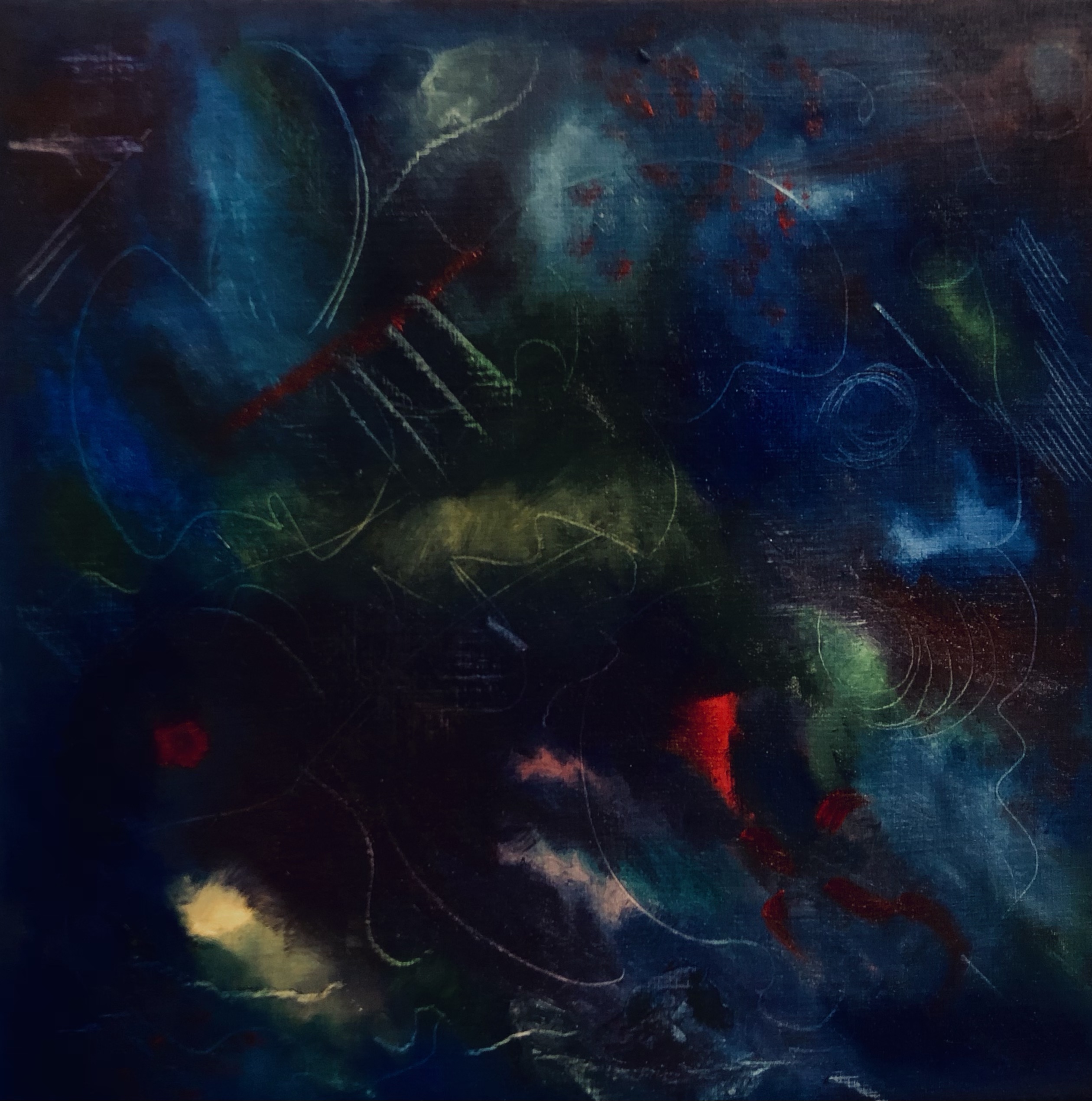 “A smaller abstract piece influenced by finding another artist that seemed to speak the same artistic language yet brought to life worlds so different from mine that they inspired my own artistic journey. To find one’s art family is exhilarating”