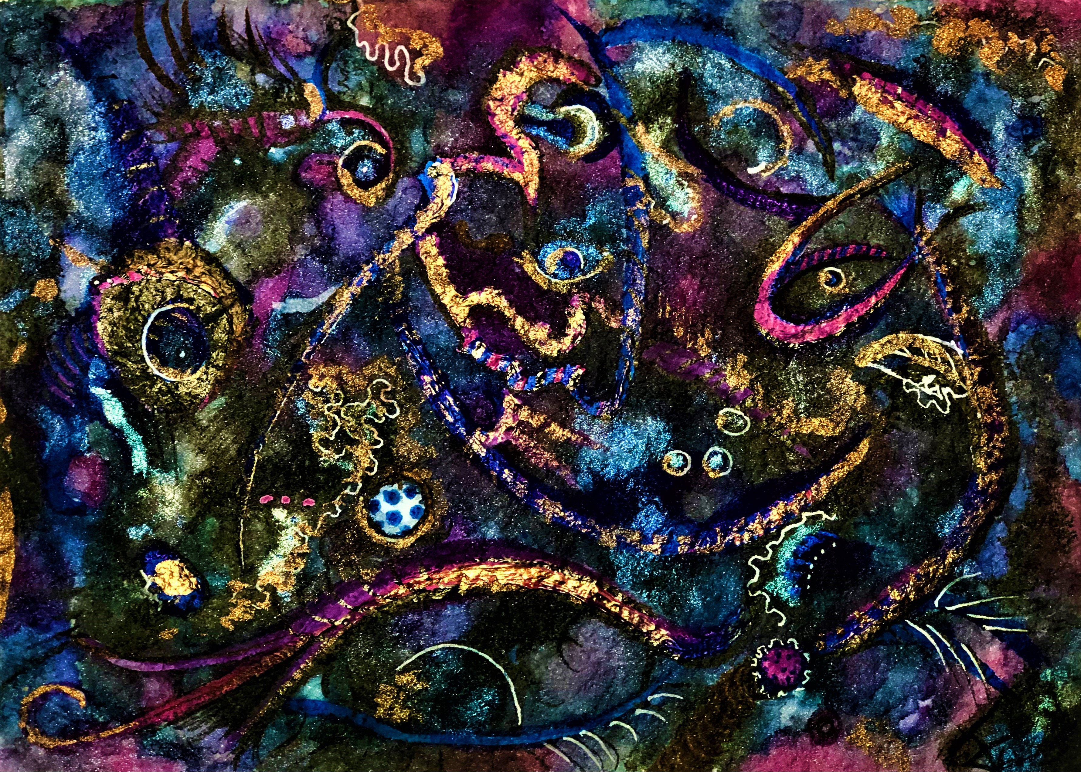 “This playful piece was simply inspired by my materials of highly reflective (fand difficult to photograph) metallic inks. I enjoy the depth produced in the contrast of deep and brilliant tones. It seemed to reveal a rich world”