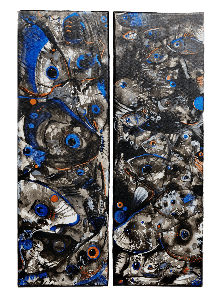 mixed media diptych laced with metallic inks of blue and copper. Each side is an 8×24″ canvas by Cedar Fox, 2024 (available at Oh! Arts Gallery in Mauston, Wisconsin)
